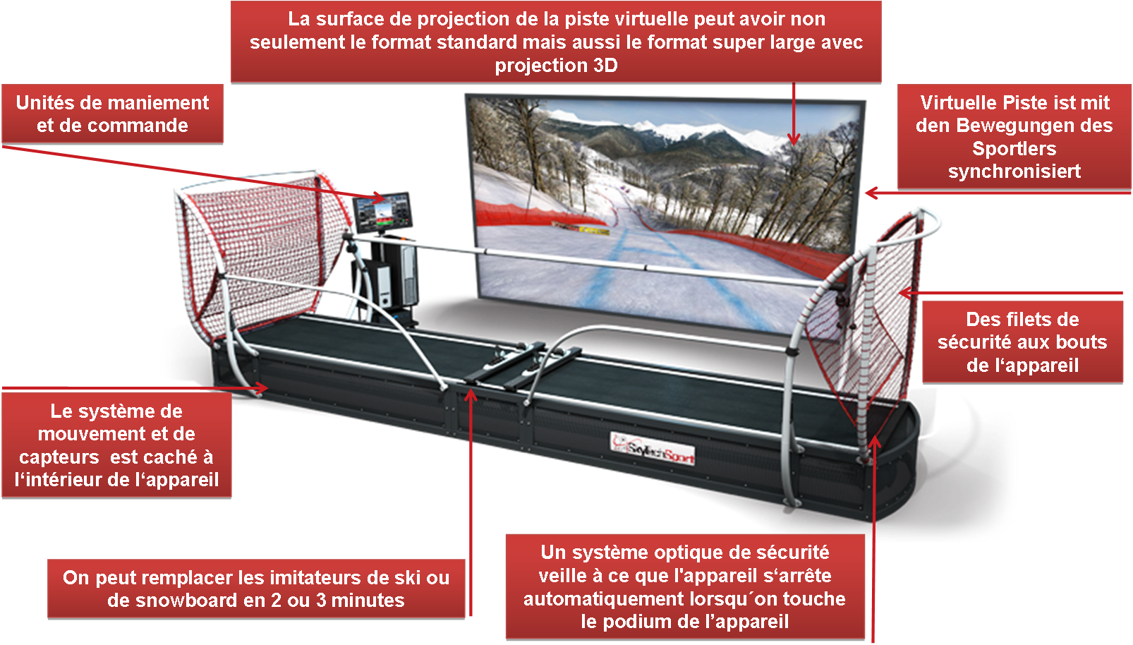 Le principe de fonctionnement des outils d´entraînement est basé sur une simulation précise des forces à laquelle l'athlète est exposé pendant une piste de descente réelle. L'athlète définit l'angle d´arête et la pression de sa position sur le simulateur du ski ou du snowboard.