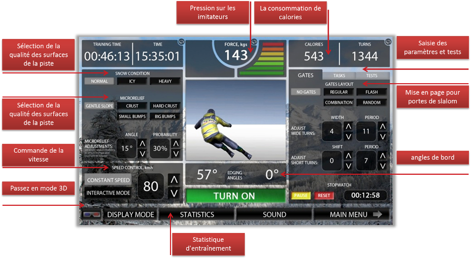 Les statistiques sur la formation sont mémorisées et un compte rendu sur l´entraînement est affiché sur l'écran. Le programme informatique peut sélectionner différentes pistes virtuelles et les conditions de pente: "douce", "glacé". Voulez-vous courir sur une piste cahoteuse? L´outil d´entraînement simule différentes conditions de descentes.
