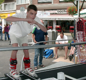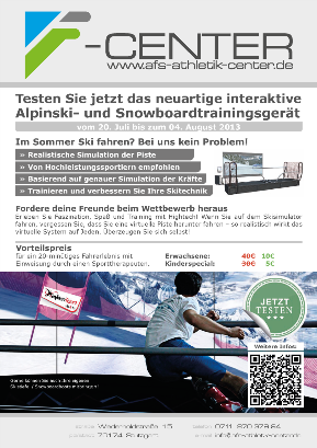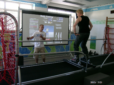 Vom 20. Juli bis zum 4. August wurde unser Gerät im AFS- Athletik- Center in Stuttgart auf "Herz und Nieren" getestet. Trotz anhaltender Hitze, bei der man eigentlich lieber baden geht, kamen Leute in den Fitnessclub um auf dem Gerät zu fahren. Alle, die die Testfahrten auf unseren virtuellen Pisten gemacht haben waren absolut begeistert. Als Sporttherapeuten haben die Betreiber des Clubs auch besonderen Nutzen des Geräts in Reha-Maßnahmen gefunden. Wir gratulieren dem Sieger des Slalomwettbewerbs auf den virtuellen Pisten!