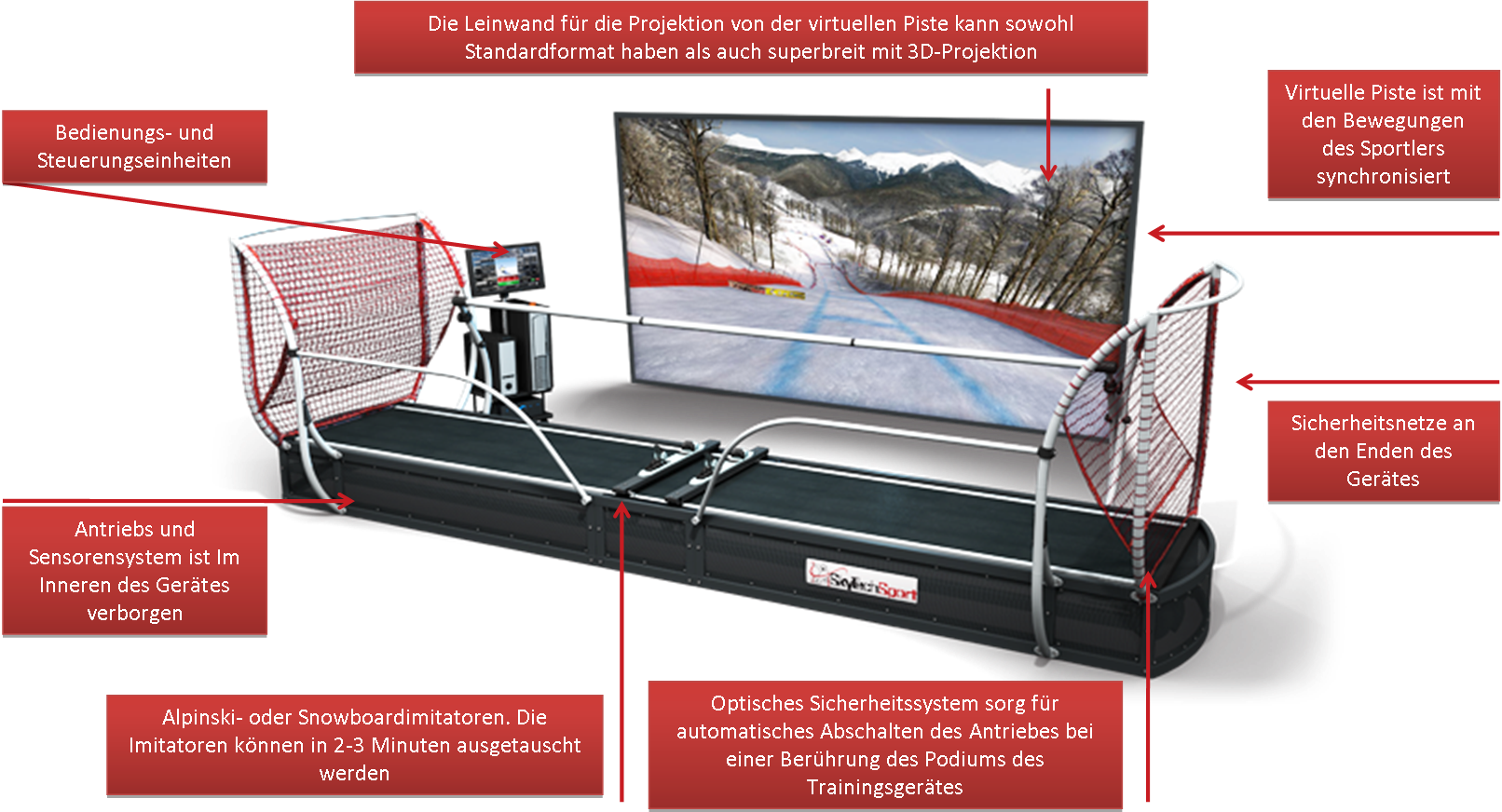 Die Software überträgt dabei alle Bewegungen des Sportlers auf die virtuelle Piste der Leinwand. Bei der Entwicklung der Trainingsgeräte wurde besonderer Wert auf eine realistische Simulation der Piste bei der Abfahrt gelegt.