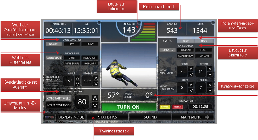 Das Trainingsgerät arbeitet interaktiv. Das heißt, der Sportler steuert mit seinen Bewegungen die Schwungphasen. Im selben Programm kann er lange und kurze Kurven fahren, ausgeglichen oder aggressiv. Das Trainingsgerät simuliert dabei genau die dynamischen Kräfte, die sich aus der zuvor gewählten Hangneigung ergeben. Dabei kann der Benutzer die Stärke selbst, interaktiv und in Echtzeit, seinem Niveau entsprechend, bestimmen.